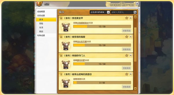 首先,玩家需要知道的是,成绩一共有三大种类,分别是战斗、冒险、生活类。但是相信很多人都不在乎什么种类的。所以,我们就先来看下无脑获取的成就: