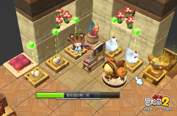 首先我们介绍一下“畜牧”玩法,在游戏中畜牧与采矿不一样,畜牧是在系统给玩家的房子里通过喂养获得素材,畜牧的等级一样为13阶,每一阶会开放不同的动物给玩家喂养。当玩家喂养成功之后会100%采集获得素材,喂养的成功率同样是“高”、“普通”、“低”以及“无”。采集获得的道具与采矿一样是角色绑定的,并且没个动物的喂养成功次数都是有限的。
