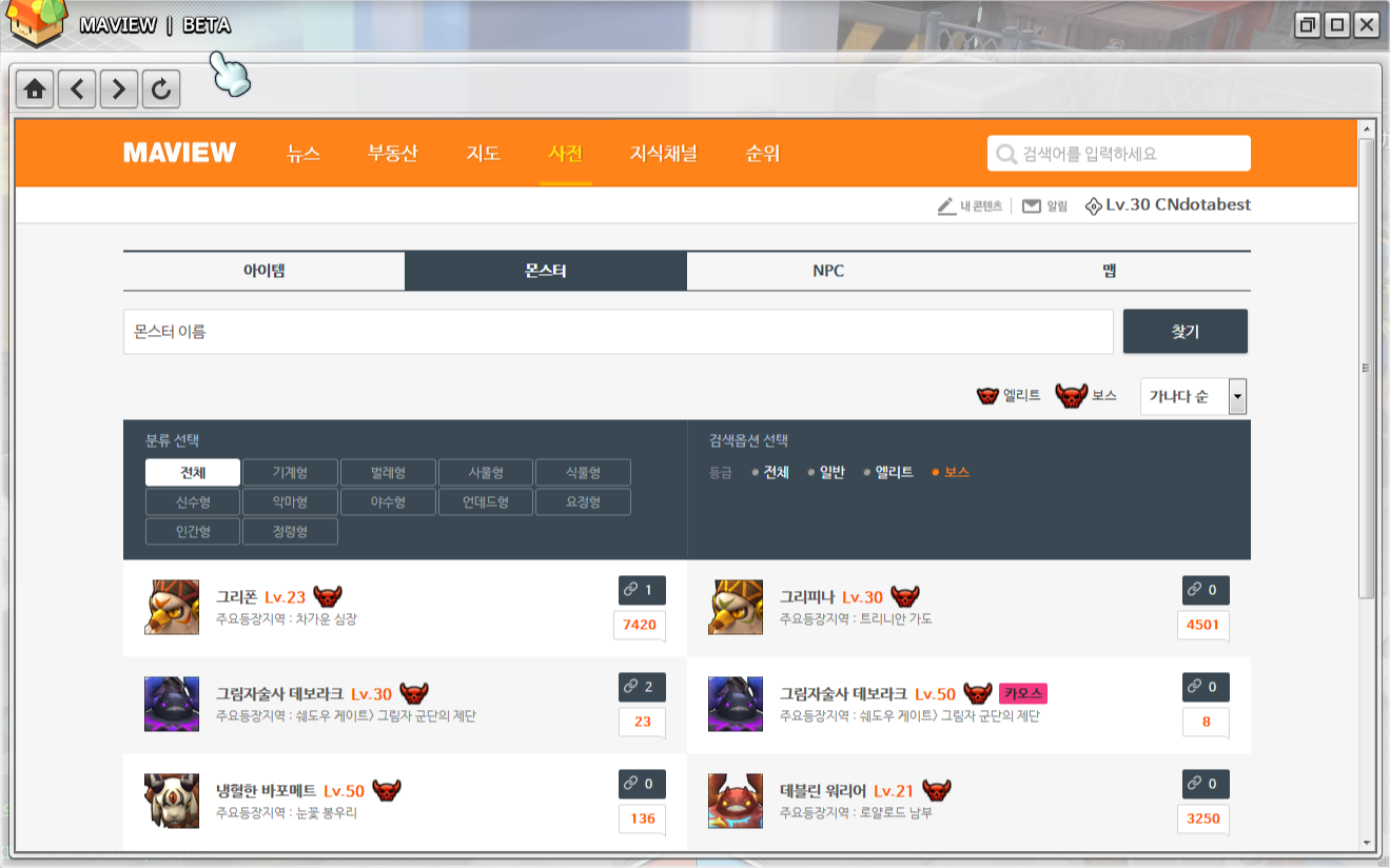 从上至下依次点击如下图中红圈的位置(사건-몬스터-보스-그리폰)。